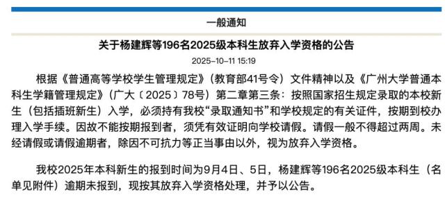 广州大学教务处 10 月 11 日就发布公告称,有 196 名 2025 级本科生逾期未报到,按其放弃入学资格处理。