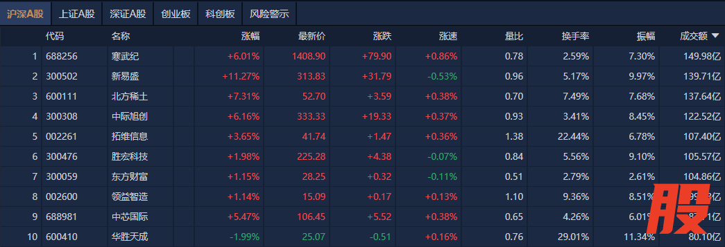 沪深两市半日成交额1.73万亿元,较上个交易日放量483亿。个股方面,寒武纪成交额超149亿元居首,新易盛、北方稀土、中际旭创成交额靠前。